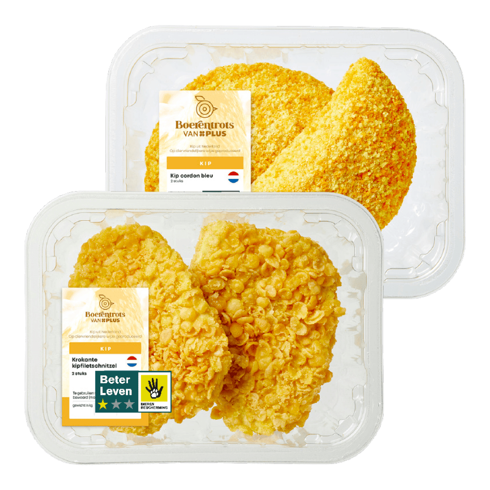 Boerentrots van PLUS Kipschnitzels en kip cordon bleu’s
