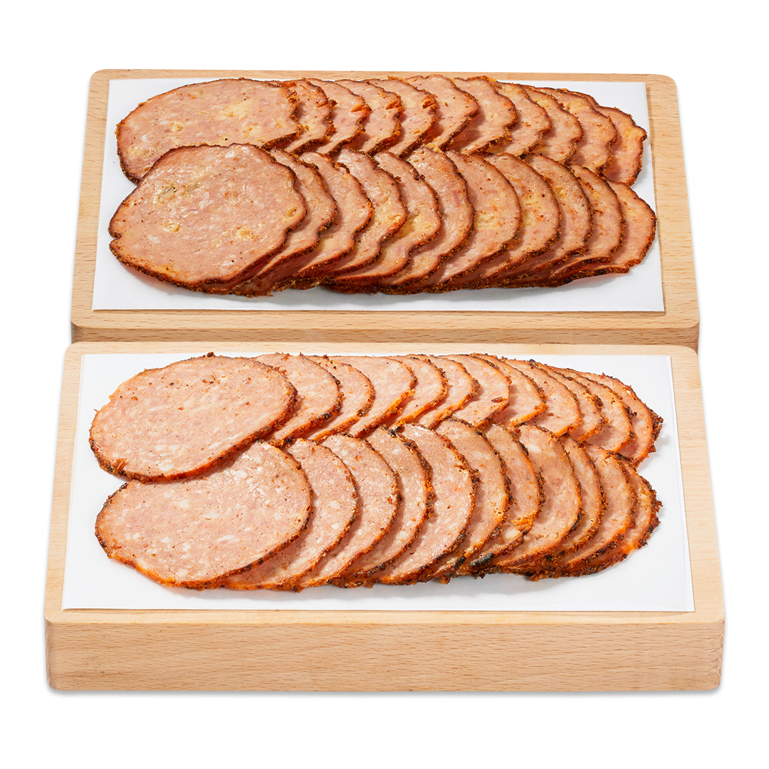 Coburger, gegrilde bacon, gerookte kipfilet of runderlever gelardeerd